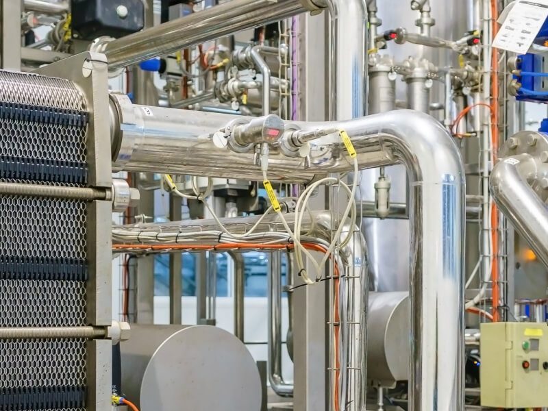 Qualitativ hochwertiger Plattenwärmetauscher mit Edelstahlgestell und Hygieneverschraubung im Einsatz in der Lebensmittelindustrie: