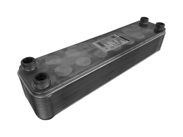 edelstahlgelöteter (Fusionstechnologie) Plattenwärmetauscher DTH-D43H-30 4 x 1" AG / 22mm Lot Kombinationsanschlüsse; 30 Platten; Tauscherfläche ca. 1,65 m²; Inhaltsvolumen primär / sekundär: 1,58 / 1,70 Liter; Plattenmaterial: rostfreier Edelstahl 1.4401; Lotmaterial: Edelstahl; Max. Betriebsdruck / Temperaturbereich: 45 bar bei -200°C bis 200°C, darüber hinaus bis 350°C bei 30 bar max.; Leergewicht: 13,2kg